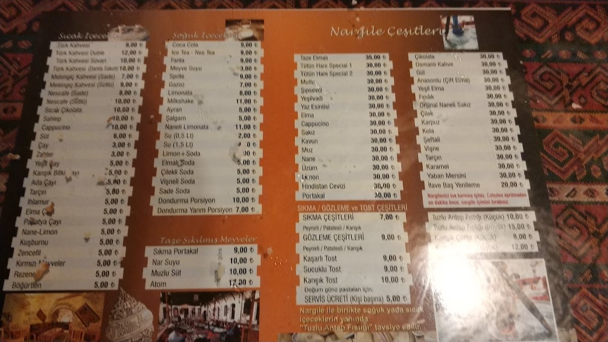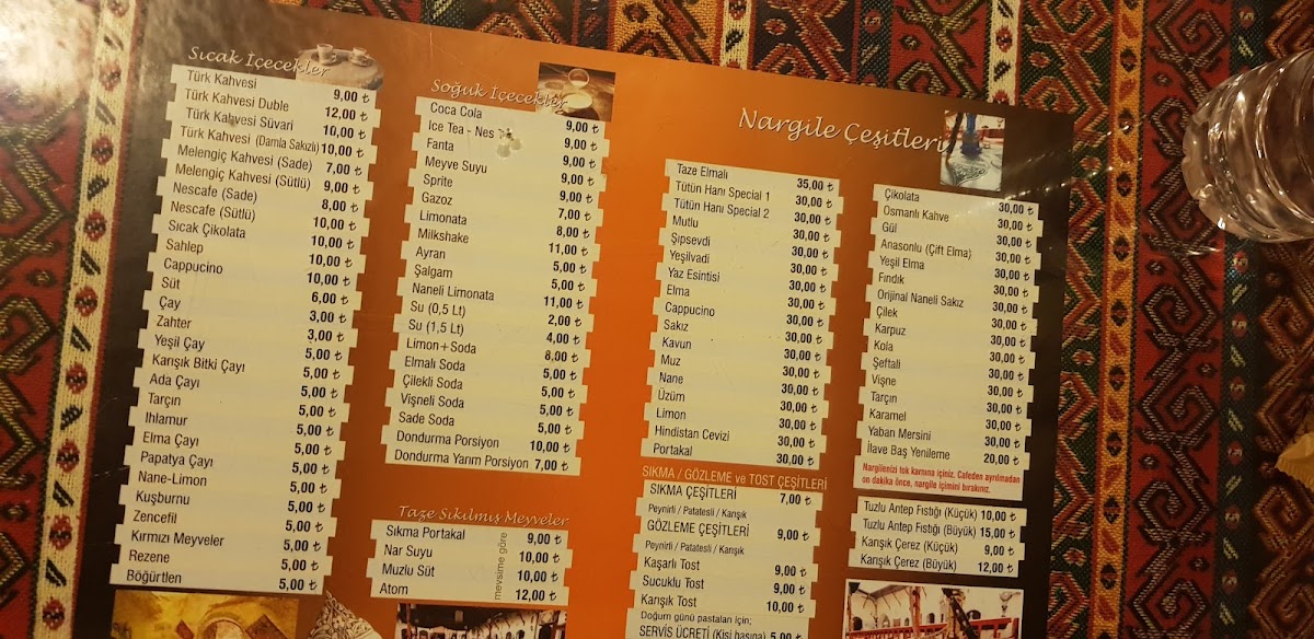 Visitors often enjoy their beverages alongside the gentle ambiance—whether settling in for a warm cup of Turkish coffee or refreshingly sipping on minty lemonade. The menu features classic staples like Türk Kahvesi and Çay, as well as distinctive choices such as sütlü menengiç kahvesi (milk-infused wild pistachio coffee) and aromatic herbal blends like zahter and naneli limonata. A key highlight is the wide variety of nargile (hookah) flavors, perfect for leisurely evenings in the warmly lit, cave-like seating areas.
